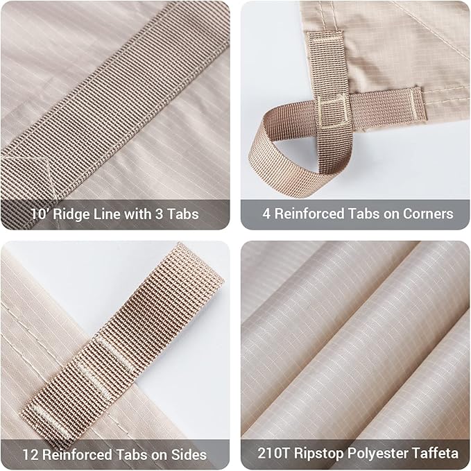 • [ALL-ROUND REINFORCED DESIGN] Features 19 reinforced pull tabs (12 along the sides, 4 on the corners) with double-stitched edges for maximum durability. Includes a 10ft Oxford ridge line with 3 extra tabs plus leak-proof treatment, making this shelter tarp both versatile and built to last
