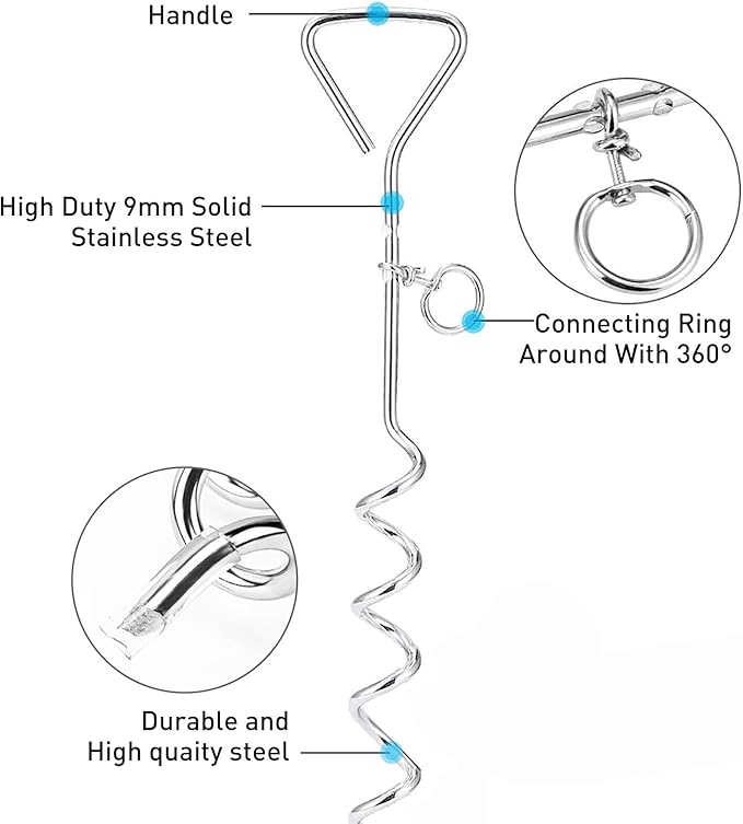 • HEAVY DUTY SPRIAL STAKE: Dog stake made of solid steel with a 360-degree Swivel ring,it also Anti-Rust.Strong enough for small to large dogs.The spiral design is specially used for sandy soil or loose ground, and is firmly screwed into the ground for worry-free installation.Help prevent your dog escaping from the yard, while also allowing it to run 360 degrees on the field.