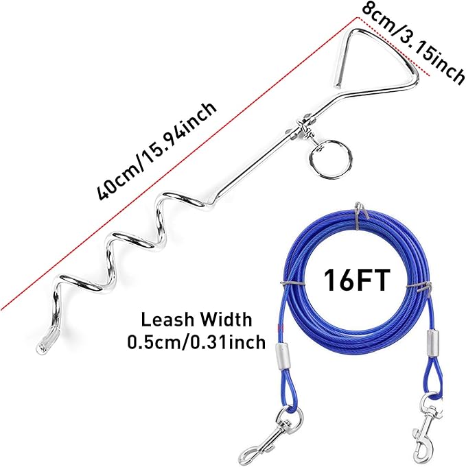 • KEEP SAFE: Our Product Includes one 16ft long dog tie-out cable and 16’’ spiral tie out stake with handle.Provide outdoor safety enclosures for dogs in unfenced yards. Very suitable for yard, park, beach or camping. The steel cable allows you to walk around worry-free, you will have a spare time to do something else you wanna to do