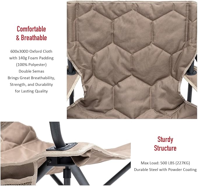 • Oversized & Maximum Weight Capacity: The oversized folding chair size is 25"x38"x38" and the sturdy steel frame construction affords up to 300 LBS (136KG) weight capacity. This oversized & padded chair is your best partner to help you to relax and enjoy your journey.