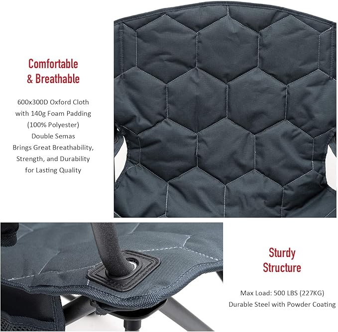 • Built to Last: The sturdy steel frame construction affords up to 500 LBS (227KG) weight capacity and the chair weights 12.8 LBS (5.8KG). The double-seam 600x300D Oxford Cloth with 140g Foam Padding has great strength, durability, and breathability. You don't have to worry for the heavy-duty use, either to buy a new camp chair in the near future.