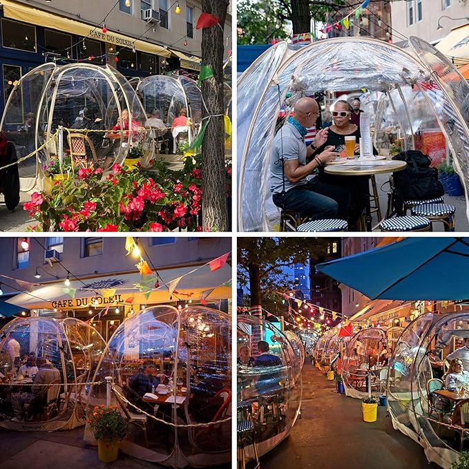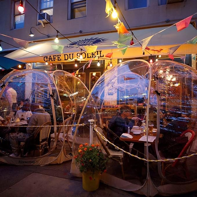 • SPACIOUS AND WARM: Alvantor big bubble gazebo provides a spacious interior shelter that comfortably fits between two and three adults. Enough room to place various pieces of furniture so you can give your bubble tent a homely feeling. The four, transparent PVC windows provide 360° view of your surroundings, whilst the inside of your bubble tent stays warm thanks to the excellent heat retention.