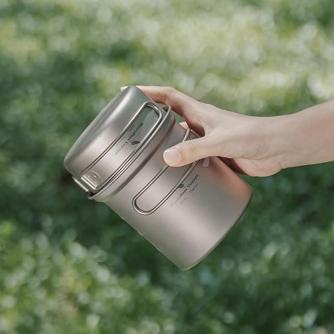 iBasingo Backpacking Cookset Titanium Camping Pots Set Ultralight Outdoor Picnic Pots Pans with Folding Handle Druable Portable Cooking Mess Kit Compact Picnic Dishes Bowls Cups (Multiple Sizes)