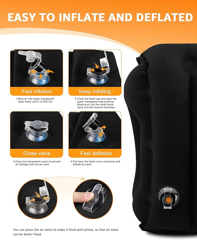 • 【Inflate And Deflate Easily】Airplane neck pillow has a 2-in-1 double valve design.The upper black air valve is a one-way air inlet for inflating or replenishing gas.bottom transparent air valve can be quickly inflated and deflated,when you are done blowing it up, push clear cover on and push whole valve in so that it is flush with the side of the travel pillow.