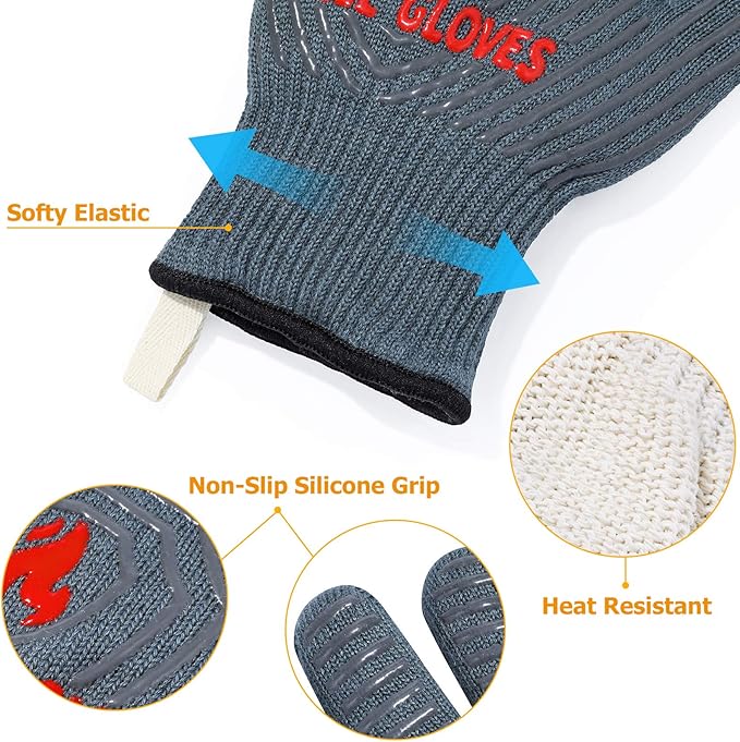 • 【Enhanced Heat Resistance】Our grilling gloves are lightweight, flexible, and provide higher heat resistance up to 1472°F. The tight aramid fiber distributes heat effectively. No matter what you grab, you won’t feel it, and the fabric fits snugly around the wrist. Which can keep your hands safe in hot conditions. "