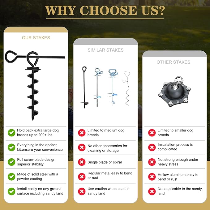 • GIVE IT AS A GIFT! Every package includes: gravity dog tie out stake + Easy-lever Installation tool + cleaning brush + leash clip + portable carrying bag. With this dog anchor, you give the gift of safety and peace of mind to pet owners.