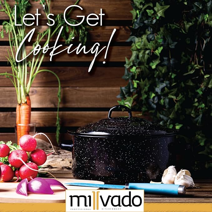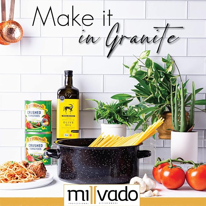 • NATURALLY NONSTICK: Stock Pots are carefully crafted with a core of carbon steel, then covered on the inside and outside with a layer of natural enamel. With these black and white speckled stoneware pots, you get the benefits of non stick without having to worry about chemicals Does not react to acidic foods, either.