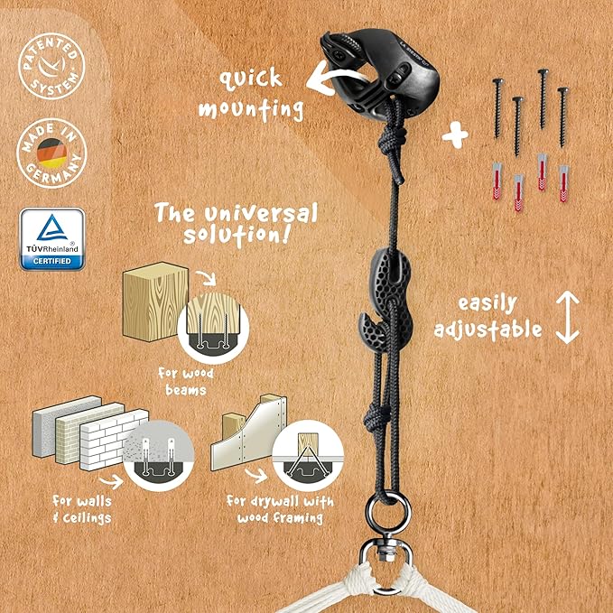 • VERSATILE WALL SUSPENSION: Our hammock chair comes with a suspension kit, making it suitable for beams wider 3.5 inches, ceilings with wooden studs, and solid masonry. Easy to install with our patented MultiSpot’s four-screw mounting system to keep your hammock chair locked in place and our patented SmartHook for hassle-free height adjustment.