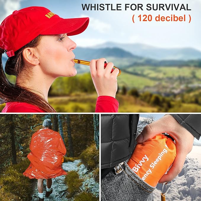 • PERFECT EMERGENCY BAG (4 Packs): The emergency sleeping bag serves as your emergency blanket, survival shelter, and emergency bivy sack all-in-one. The special material reflects 90% of your body's heat back to you, stay warm and alive in extreme conditions. Save your life in an emergency. Survival whistle provides up to 120 decibels sound, enough to be heard at long distance. Bright orange color help you be found more easily in an emergency. It is an essential survival tool!