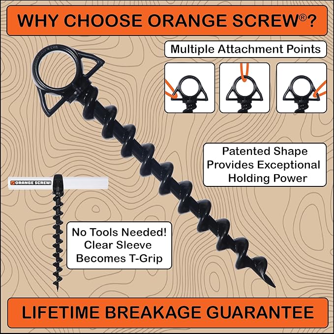 • HEAVY DUTY PERFORMANCE: Our Large Orange Screw Ground Anchors weighing 3.6 oz with a 12 1/4" length and 1 1/8" diameter are designed to secure loads up to 500 pounds, making them ideal for high wind conditions and ensuring your tent, canopy, or shade shelter stays firmly in place. The best solution for reliably securing your camping gear.