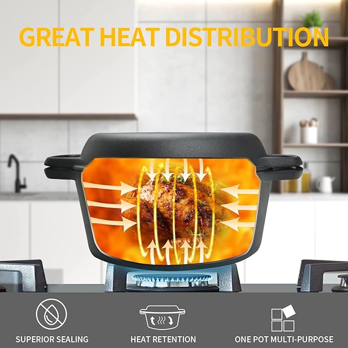 • Pre-seasoned 2-in-1 cast iron dutch oven: The 2-In-1 cast iron dutch oven pot with skillet lid has been burned with vegetable oil,(no synthetic coatings or chemicals). The shallow skillet that can be used as a lid