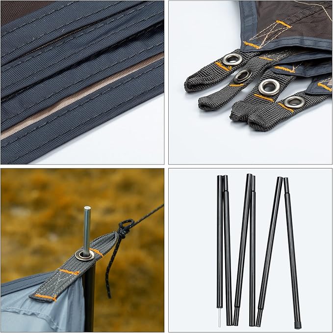 • Multiple Ways to Use: Tent Tarpcan provide a shady environment, or can be used as a floor covering cloth. When you have a picnic outdoors, it can become a picnic mat to isolate the wet ground, to ensure that the clothes are dry, and the food is hygienic. When hiking, his abrasion resistance(150D Oxford cloth)is enough to deal with the unequal terrain outdoors, allowing you to rest and adjust anytime, anywhere.