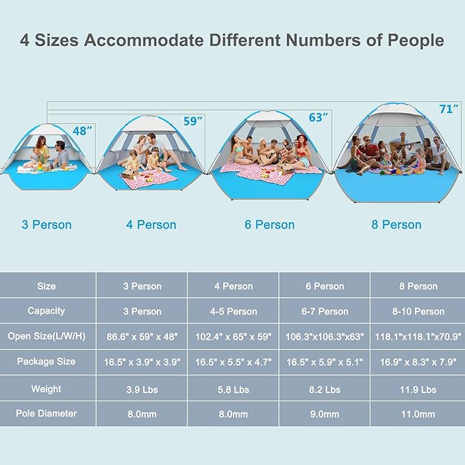 • Super Large Space: Size of 86.6"L x 59"W x 48"H, 30% bigger than other beach tents at similar price, fits 3-4 person. It provides a comfortable space for family and friends on the beach