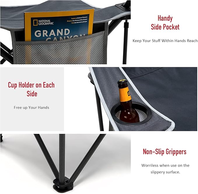 • Super Handy & Space Saving: The folding chairs camping has a built-in bottle opener and 2 cup holders free your hands while camping, picnic, hiking, traveling or fishing, and easily store your drinks, sunglasses, and phone within hands reach. The packed size is 40"x8.5"x8".