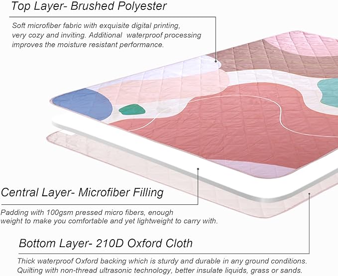 • Premium Three Layers Design: Crafted with soft brushed fabric on top, thick microfiber padding, and 210D Oxford backing. Both sides feature a waterproof coating, while ultrasonic quilting improves moisture resistance and insulation from grass or sand