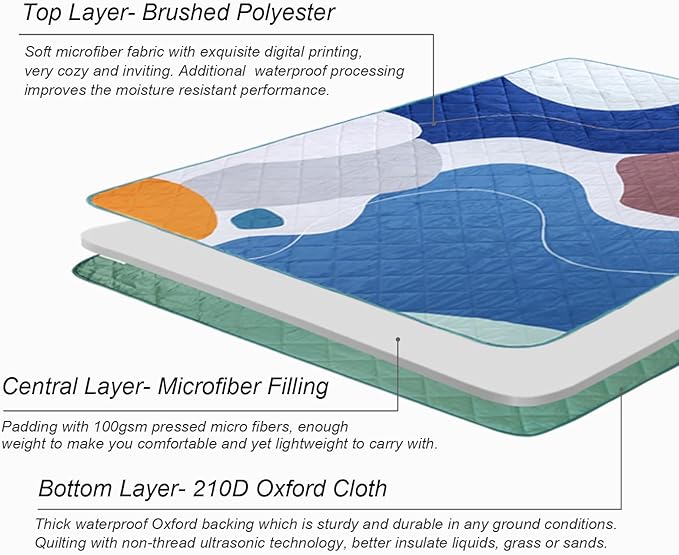 • Premium Three Layers Design: Crafted with soft brushed fabric on top, thick microfiber padding, and 210D Oxford backing. Both sides feature a waterproof coating, while ultrasonic quilting improves moisture resistance and insulation from grass or sand