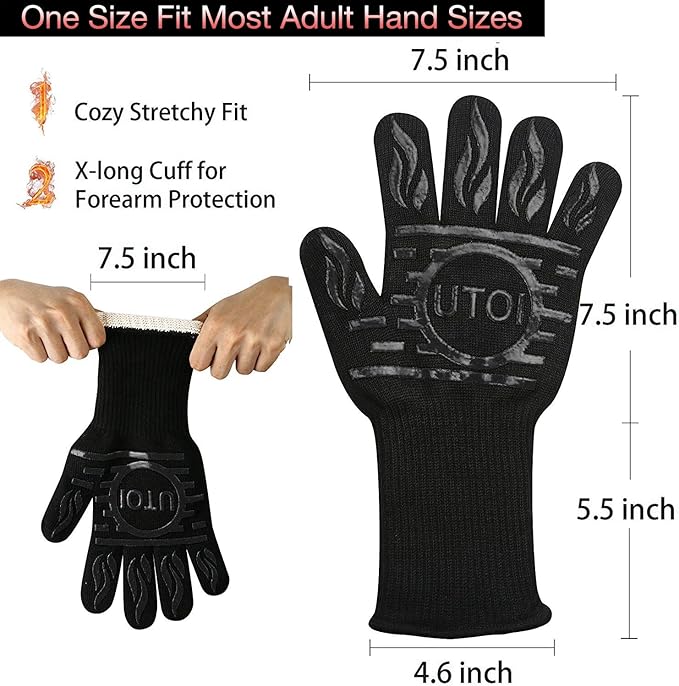 • High Heat Resistant: UTOI Heat and flame resistant gloves protect your hands against high temperature when cooking, grilling, baking, handling hot meat, and working around hot ovens, smokers, fireplaces, campfires, and wood stoves