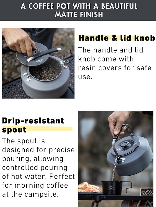 • This ultralight camping coffee kettle processed with a hard alumite treatment with corrosion resistance, which is sturdy and hard to get corrosion.