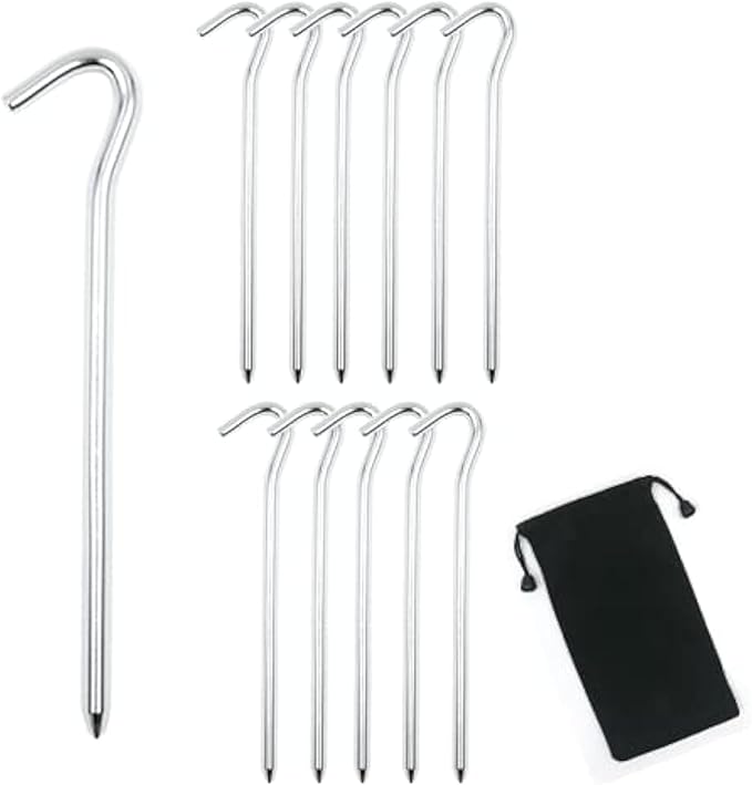 • Multi-Purpose: The 12Packs ground tent stakes are suitable for nailing tents, canopies, tarps, and etc. to the ground. Perfect for outdoors camping and backpacking. Long and large tent stakes make sure your camping trip safe in the tents.