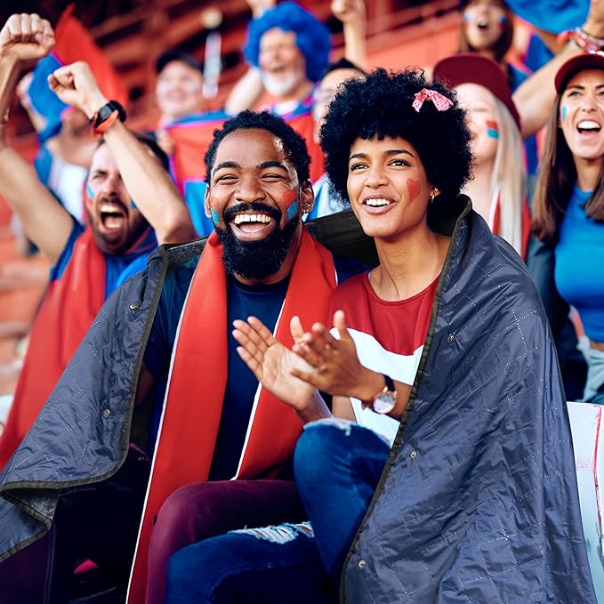 • REVERSIBLE AND WEARABLE: This sports blanket is reversible and the fleece blanket can be transformed into a waterproof poncho stadium blanket with our 3-button design to keep you cozy and dry at any sports game or festival. Big enough to share with a friend!