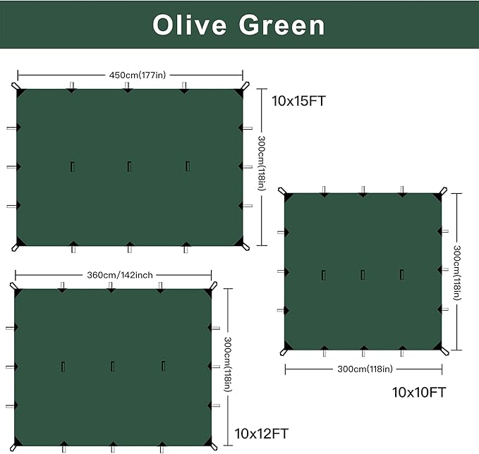 • 【LIGHTWEIGHT & PORTABLE】Our waterproof camping tarp Includes 6 guy lines, 6 stakes, 6 heavy duty black tarp clips and 1 carrying bag. Open size is 118in x 142in / 300cm x 360cm, about 1kg(2.2lb). Our camp tarp comes with a portable designed storage bag for easier carrying. Unfold the camping tarp and lay it on ground use as tent footprint; with the stakes and ropes when take it as sun canopy or rain fly