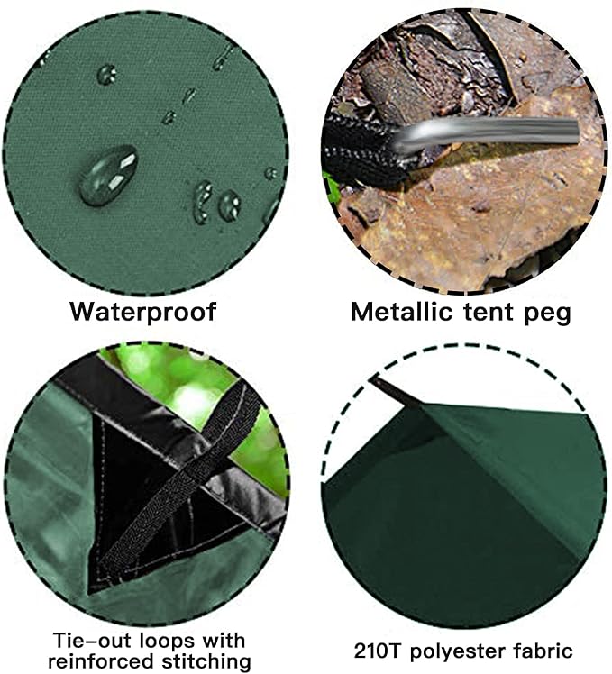 • 【WATERPROOF & UV PROTECTION】KALINCO waterproof camping tarp tent is made of 210T polyester with PU 3000mm waterproof coating, and has a taped central seam, quick-drying fabric ideal for rain flies. Our camping tarp coated with PU Inner layer, provide a UV protection in the sun
