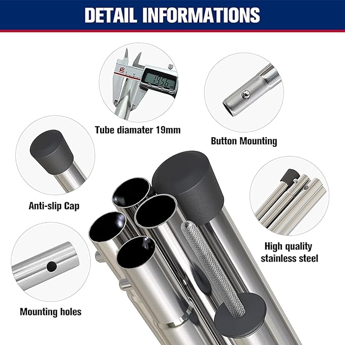• THICKER DESIGN -- Newly upgraded thicker camping poles, made of high quality stainless steel material, the wall thickness of the poles is upgraded from 0.3mm to 0.6mm, which enhances the weight-bearing capacity of the tarp poles, the whole pair of poles weighs about 2.9lbs and can easily support your tarp!