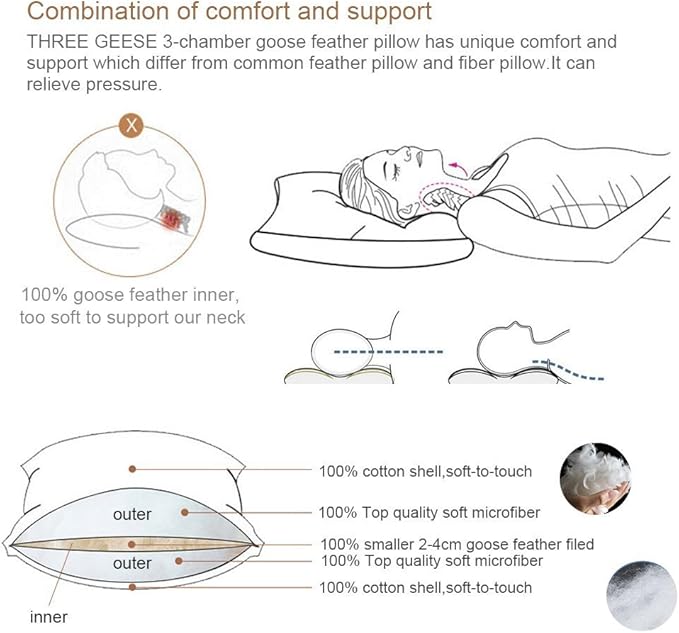 • THREE CHAMBER DESIGN- The pillow has an inner chamber filled with goose feathers, providing support & volume. The two outside chambers are filled with high quality polyester, making them particularly cuddly.