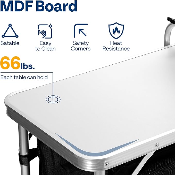 • RELIABLE MATERIAL - The X-shaped aluminum bracket and adjustable rubber anti-slip foot pads add stability and steadiness to the camping table; And the rust-resistant material makes the table extremely durable; 2 side tables and an operating table can hold up to 66 lbs each