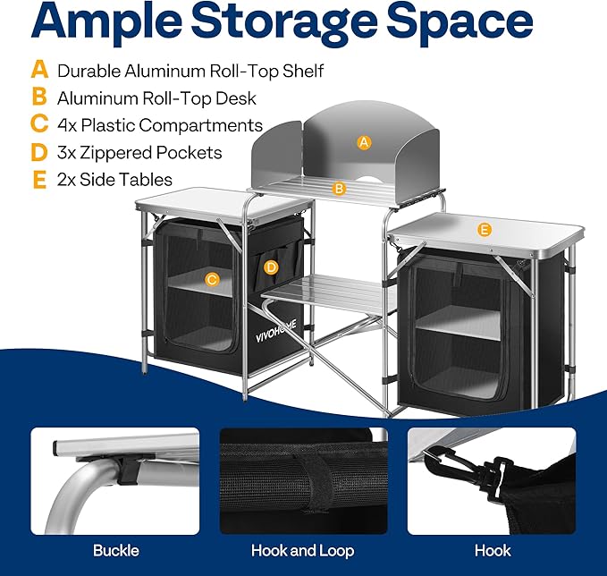• LARGE STORAGE SPACE - Our kitchen table consists of an aluminum roll-top desk, an aluminum roll-top shelf, 2 side tabletops, and 4 built-in plastic compartments; The 2 600D PVC zipper storage shelves with mesh panels provide visibility and can store various cookwares, preventing pets from accessing accidentally; You can also put an ice maker, drinks, snacks, cups, plates, and blender on the spacious desktop