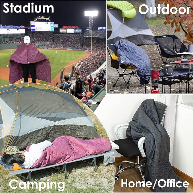 • Multifunctional. With the buttons and elastic straps, this blanket can be used as quilt, poncho, shawl, temporary sleeping bag. You can also put two blankets together and make it one two-person sleeping bag. Keeping you cozy while sitting around the fire or on your couch, lying in hammocks, reading books, tailgating, cooking meals. Perfect for camping, backpacking, hiking, mountaineering, traveling, lounging, picnics, beach trips, concert events, airplane trips, and other outdoor activities.