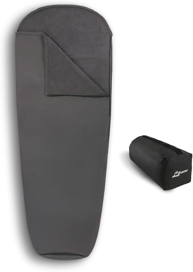 Litume All Season Fleece Sleeping Bag Liner Adds Up to 27°F/ 15°C, Lightweight Mummy Sleeping Sack for Cold Weather and Winter Backpacking, Camping, Traveling with Drawstring Hood and Stuff Sack E629