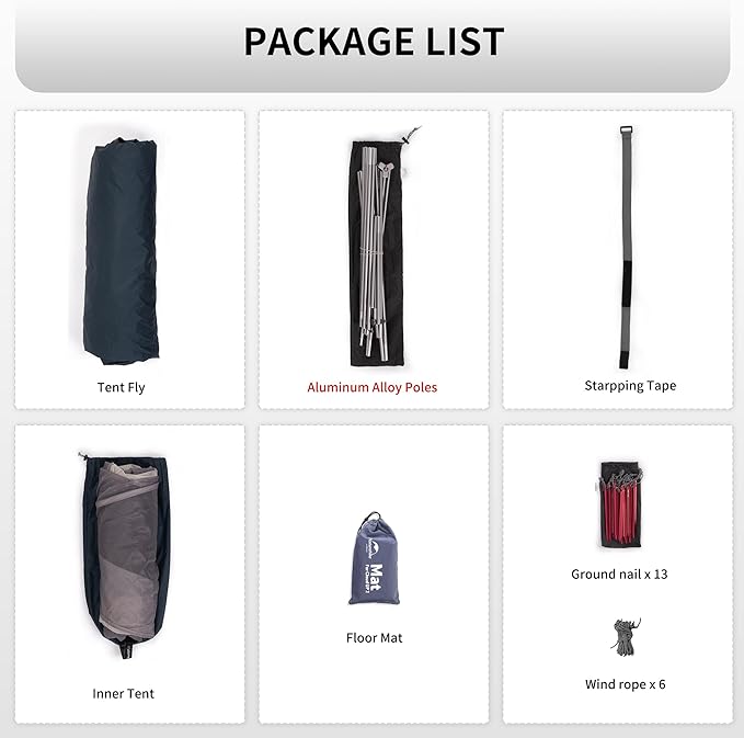 • Included Components : Tent fly * 1,Inner tent * 1, 7001 Aluminum alloy *1,Strapping Tape *1, Tent stakes*13, wind ropes * 6 , footprint *1, carry bag *1. Tent fly * 1,Inner tent * 1, 7001 Aluminum alloy *1,Strapping Tape *1, Tent stakes*13, wind ropes * 6 , footprint *1, carry bag *1.