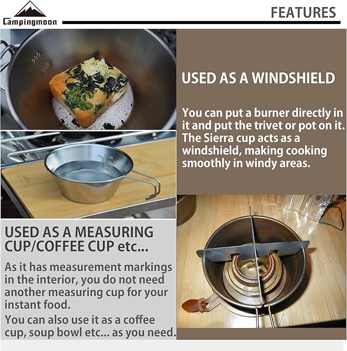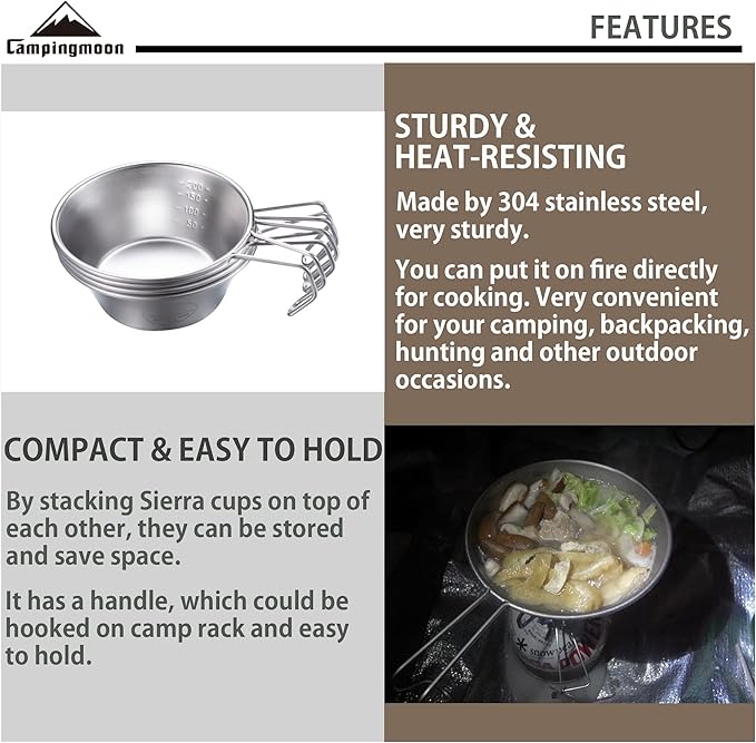 • 【STURDY & HEAT-RESISTING】CAMPINGMOON sierra cup is made by 304 stainless steel, very sturdy. You can put CAMPINGMOON sierra cup on fire directly for cooking. Very convenient for your camping, backpacking, hunting and other outdoor occasions.