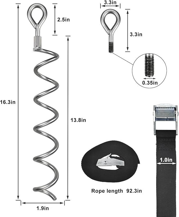 • DURABLE & STRONG GROUND ANCHORS: Spiral ground anchors made of heavy-duty steel, and the latest spiral top angle design can reduce the force to better ensure stability and durability, so it will not easily break even when used in bad weather conditions. The silver powder coating dog tie out stake can effectively prevent rust and cracking and help extend the service life of the ground anchor stakes