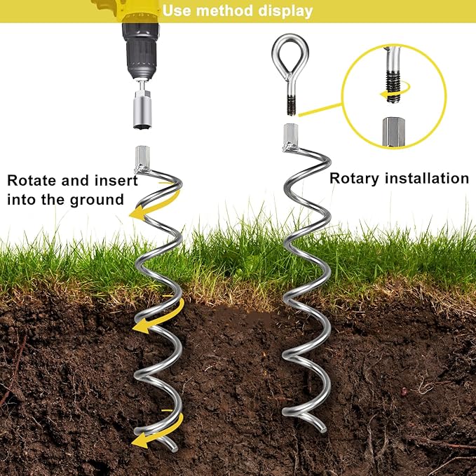 • EASY TO USE TRAMPOLINE STAKES: Spiral design make it much easier and faster to twist into the ground deeply; just push the sharp-edged tips of earth anchors into the ground, and fully insert the ground anchors screw into the ground with the help of drilling machine to achieve stability of the trampoline
