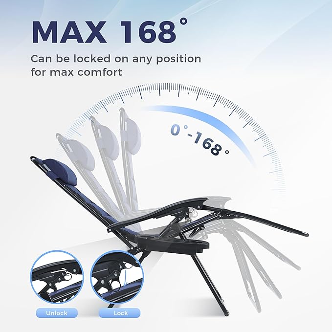• 【Lockable Reclining System Gravity Chairs】: The lock catch is more convenient to operate than twist knobs. Simply pull the clip back to lock and push the clip front to unlock. It can be adjusted at any angle from 0 to 168 degrees, smoothly glides to an ergonomic zero-gravity position