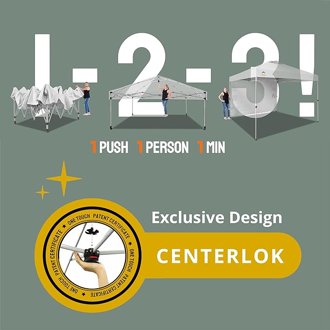 • ONE BUTTON EASY SET UP - Our 10x10 pop up canopy tent features patented one push center lock tech. With just a single push, the central hub locks the poles in place. Designed for the next generation, this outdoor canopy for patio can be set up by two people in seconds without any tools. Three adjustable height settings with soft, pinch-free buttons ensure convenience and safety, making it perfect for camping, beach outings, craft fairs, tailgating, farmer markets, outdoor BBQs, and more