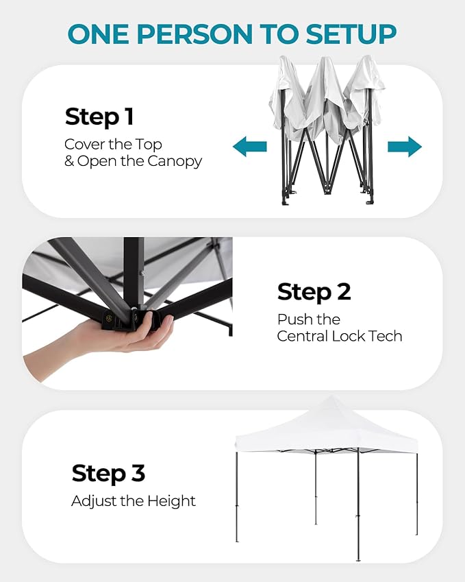 • Easy Set Up: Outdoor canopy can be quickly installed by 2 people in minutes without tools. You only need to push central lock tech to finish structure of the outdoor canopy. Available in 10x10, 10x15, and 10x20 sizes to suit your needs