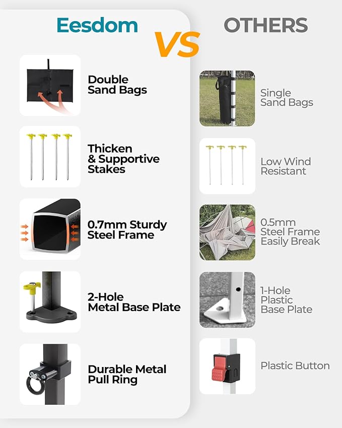 • Enhanced Heavy-Duty Canopy Frame: The Eesdom 10x10 pop up canopy features a commercial-grade full truss design for maximum durability and rust resistance. The upgraded top bracket with a 32° tilt angle ensures a taut canopy cover, preventing water pooling. Thickened 33mm steel tubes with 0.7mm wall thickness provide superior strength
