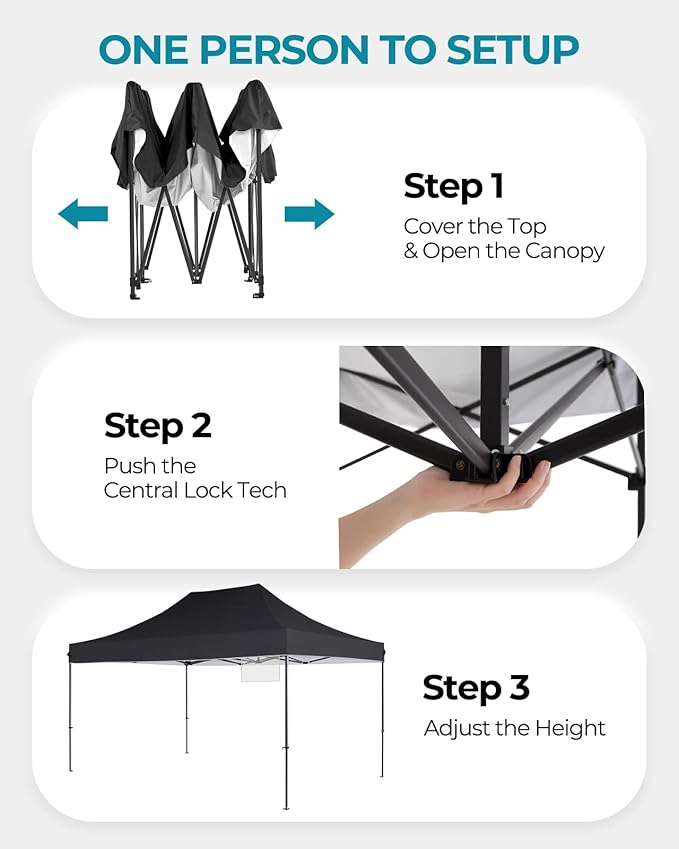 • Easy Set Up: Outdoor canopy can be quickly installed by 2 people in minutes without tools. You only need to push central lock tech to finish structure of the outdoor canopy. Available in 10x10, 10x15, and 10x20 sizes to suit your needs
