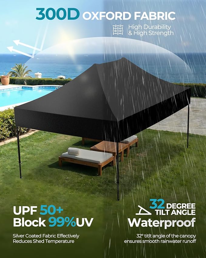 • 300D Fabric–100% Waterproof, UPF 50+, Windproof: 10x15 canopy tent features 300D Oxford fabric with high tear resistance for long-lasting use. Its 5000mm+ waterproof rating outperforms standard tents (1500-2000mm), handling heavy rain. UPF 50+ blocks 99% of UV rays, while the PU coating enhances light transmission and wind resistance