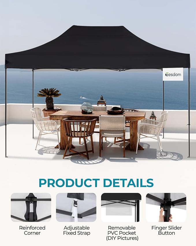 • Enhanced Heavy-Duty Canopy Frame: The Eesdom 10x15 pop up canopy features a commercial-grade full truss design for maximum durability and rust resistance. The upgraded top bracket with a 32° tilt angle ensures a taut canopy cover, preventing water pooling. Thickened steel tubes with 0.7mm wall thickness provide superior strength