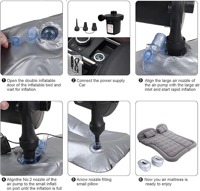 • SUV Inflatable Mattress Is Easy To Inflate: Equipped with car power fast charging electric pump for air mattress,12 volt DC power plug,Used to connect car power socket,Open exhaust valve,Press and discharge air,Double-layer air nozzle,let The air can only enter,And it can be inflated quickly and easily.