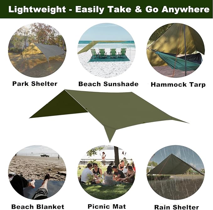 • Easy to Set Up & Steady: This backpacking tarp comes with 8 reflective ropes and 8 aluminum stakes for quick setup in just minutes. Use it with your camping tents and hammocks for a cool resting environment. Note that tarp poles are NOT INCLUDED