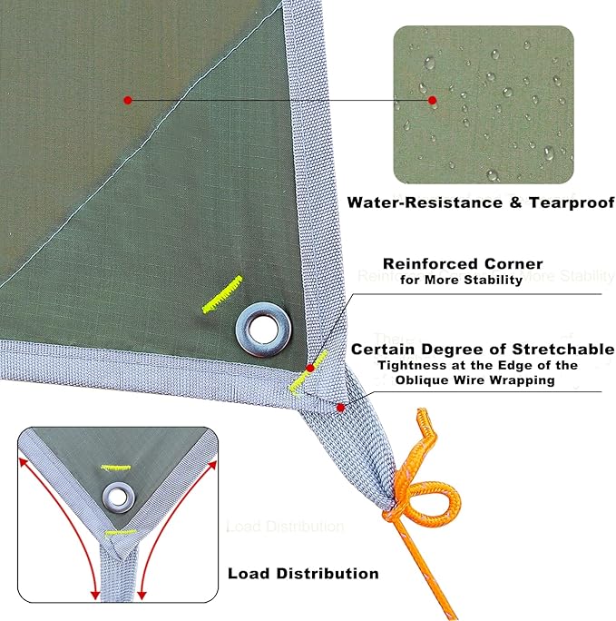 • Waterproof/UV Resistant: Made from thickened 210 T polyester fabric, this tarp features PU3000 mm water resistance and UV50+ protection, keeping out wind and rain to keep your tent and camping gear dry