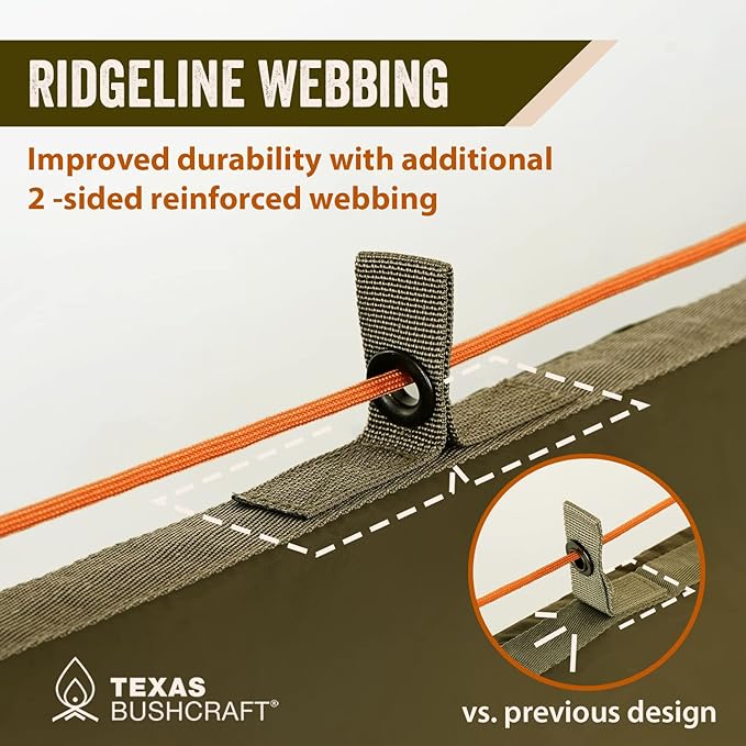 • DURABLY CONSTRUCTED from 70D ripstop nylon tarp denier with 210T thread count, the Texas Bushcraft Tarp has superior puncture resistance and industry-leading 15,000mm waterproof PU coating. Waterproof heat tape seams, including along the ridgeline are reinforced with nylon webbing, making our survival tarp a reliable shelter from downpours and rough terrain.