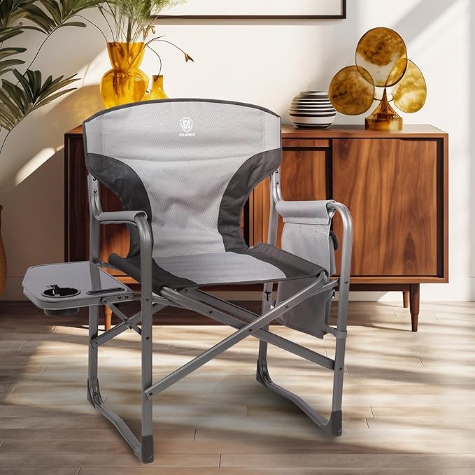 • REDEFINED RELAXATION: Designed for convenience, this foldable director's chair features sturdy armrests that offer better support than traditional soft ones. It also includes a handy side table with a cup holder and storage slots, plus additional pockets to keep essentials within reach