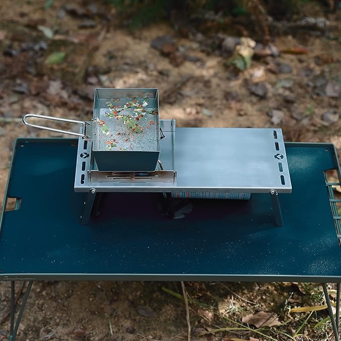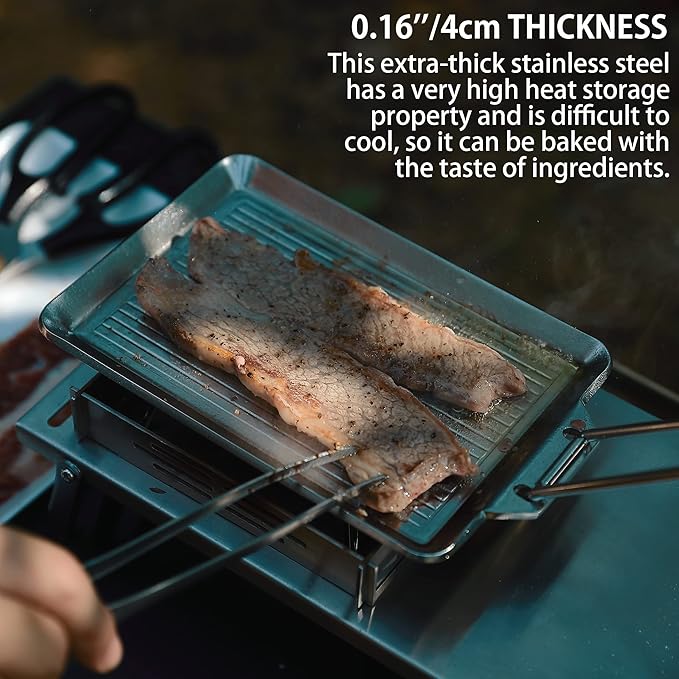 • 304 stainless steel extra-thick grill griddle plate with cover for solo camping, backpacking, overlanding, boondocking etc
