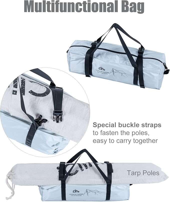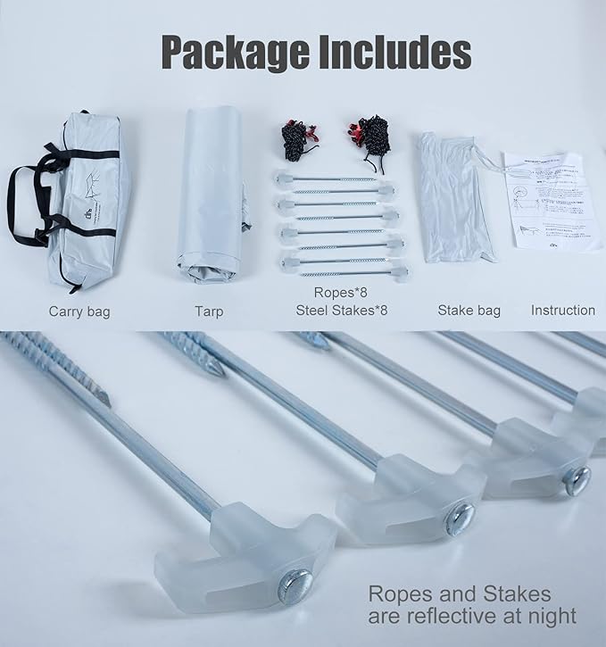 • Portable, large tarp but folds small; Lightweight, only weights 4.8 lbs; Storage bag with carry strap and buckle strap to fasten the poles (sold separately), easy to carry them together, Packed Size 16.5" × 4.7" × 4.7"; Screw stakes perform great in a wide range of soil conditions; Reflective guy lines and stakes, no need to worry about accidents. Easy to clean and set up; Package includes: 1 tarp, 8 stakes, 8 guy lines, 1 stakes store bag, 1 carry bag, setup instructions